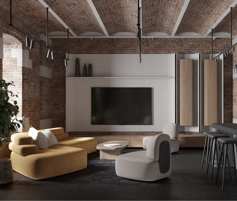 и барной стойкой, а также TV с удобным диваном, креслами и журнальным столиком